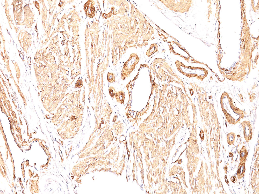 Actin is a major component of the cytoskeleton and is present in most cell types. This MAb is highly specific to actin from smooth muscles. Its epitope lies in the first four N-terminal amino acids. This MAb does not stain cardiac or skeletal muscle; however, it does stain myofibroblasts and myoepithelial cells. This antibody could be used together with anti-muscle specific actin and myogenin in making a diagnosis of smooth muscle and skeletal muscle tumors. In most cases of rhabdomyosarcoma, this antibody yields negative results whereas anti-muscle specific actin and myogenin are positive. Leiomyosarcomas are positive only with anti-muscle specific actin and anti-smooth muscle actin and are negative with anti-myogenin.