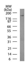 Western blot analysis of HeLa lysate probed with Podocalyxin Ab (3D3). |