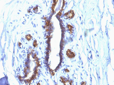 In Western blotting, it recognizes proteins in MW range of 265-400kDa, identified as different glycoforms of EMA. This MAb reacts with the DTRP epitope in the tandem repeats. The α subunit has cell adhesive properties. It can act both as an adhesion and an anti-adhesion protein. EMA may provide a protective layer on epithelial cells against bacterial and enzyme attack. The β subunit contains a C-terminal domain, which is involved in cell signaling, through phosphorylations and protein-protein interactions. In immunohistochemical assays, it superbly stains routine formalin/paraffin carcinoma tissues. Antibody to EMA is useful as a pan-epithelial marker for detecting early metastatic loci of carcinoma in bone marrow or liver.