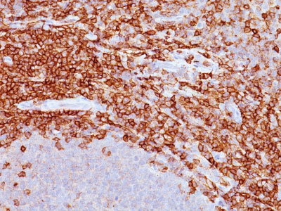 It recognizes a cell surface glycoprotein of 95/115/135kDa (depending upon the extent of glycosylation), identified as CD43. 70-90% of T-cell lymphomas and from 22-37% of B-cell lymphomas express CD43. No reactivity has been observed with reactive B-cells. So a B-lineage population that co-expresses CD43 is highly likely to be a malignant lymphoma, especially a low-grade lymphoma, rather than a reactive B-cell population. When CD43 antibody is used in combination with anti-CD20, effective immunophenotyping of the lymphomas in formalin-fixed tissues can be obtained. Co-staining of a lymphoid infiltrate with anti-CD20 and anti-CD43 argues against a reactive process and favors a diagnosis of lymphoma.