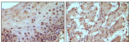 Figure 1: Immunohistochemical staining of paraffin-embedded human normal esophagus (A) and stomach (B) tissue, showing nucleus localization using Rb mouse mAb with DAB staining. |