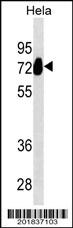ALPP Antibody (N-term) (Cat. AMM02401G) western blot analysis in Hela cell line lysates (35μg/lane).This demonstrates the ALPP antibody detected the ALPP protein (arrow). |