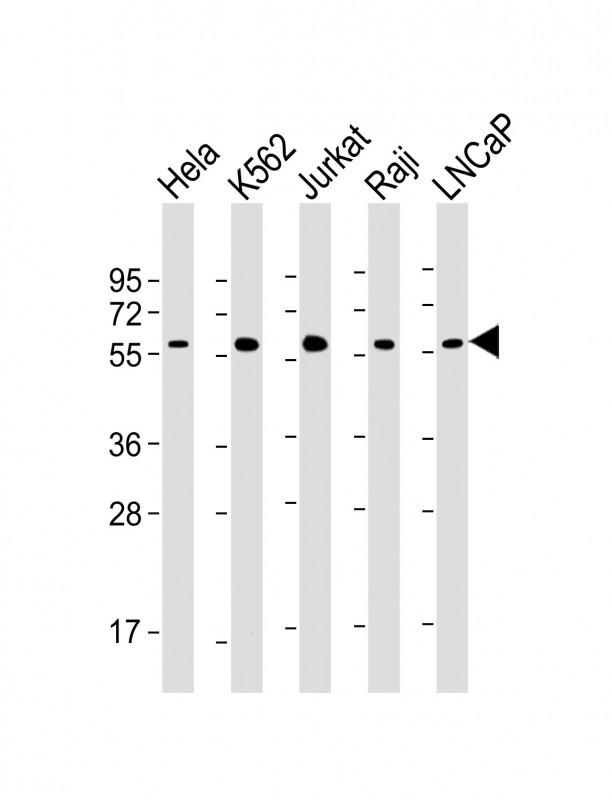 All lanes : Anti-MYC Antibody at 1:2000 dilution Lane 1: Hela whole cell lysate Lane 2: K562 whole cell lysate Lane 3: Jurkat whole cell lysate Lane 4: Raji whole cell lysate Lane 5: LNCaP whole cell lysate Lysates/proteins at 20 μg per lane. Secondary Goat Anti-mouse IgG, (H+L), Peroxidase conjugated at 1/10000 dilution. Predicted band size : 51 kDa Blocking/Dilution buffer: 5% NFDM/TBST. |