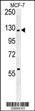 RABGAP1 Antibody (N-term) (Cat. APR03443G) western blot analysis in MCF-7 cell line lysates (35ug/lane).This demonstrates the RABGAP1 antibody detected the RABGAP1 protein (arrow).