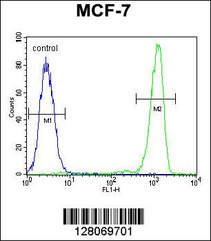 RABGAP1 Antibody (N-term) (Cat. APR03443G) flow cytometric analysis of MCF-7 cells (right histogram) compared to a negative control cell (left histogram).FITC-conjugated goat-anti-rabbit secondary antibodies were used for the analysis. |