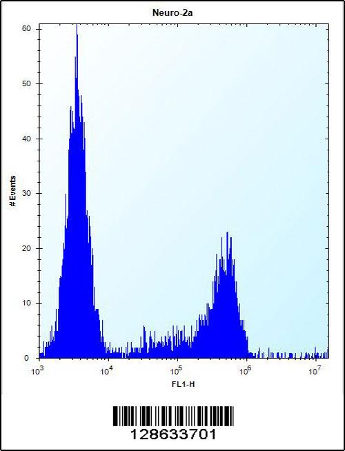 CASC4 Antibody (C-term) (Cat. APR03445G) flow cytometric analysis of Neuro-2a cells (right histogram) compared to a negative control cell (left histogram).FITC-conjugated donkey-anti-rabbit secondary antibodies were used for the analysis. |