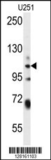 WWC3 Antibody (C-term) (Cat. APR03447G) western blot analysis in U251 cell line lysates (35ug/lane).This demonstrates the WWC3 antibody detected the WWC3 protein (arrow).
