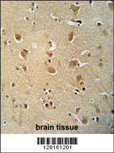 WWC3 antibody (C-term) (Cat. APR03447G) immunohistochemistry analysis in formalin fixed and paraffin embedded human brain tissue followed by peroxidase conjugation of the secondary antibody and DAB staining. This data demonstrates the use of the WWC3 antibody (C-term) for immunohistochemistry. Clinical relevance has not been evaluated. |