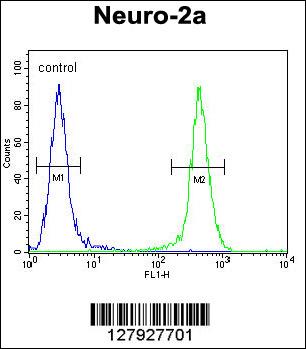 JOSD2 Antibody (N-term) (Cat. APR03452G) flow cytometric analysis of Neuro-2a cells (right histogram) compared to a negative control cell (left histogram).FITC-conjugated goat-anti-rabbit secondary antibodies were used for the analysis. |