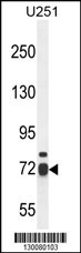 WDR76 Antibody (C-term) (Cat. APR03459G) western blot analysis in U251 cell line lysates (35ug/lane).This demonstrates the WDR76 antibody detected the WDR76 protein (arrow).