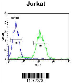 CD34 Antibody (Center) (Cat. APR03463G) flow cytometric analysis of Jurkat cells (right histogram) compared to a negative control cell (left histogram).FITC-conjugated goat-anti-rabbit secondary antibodies were used for the analysis. |