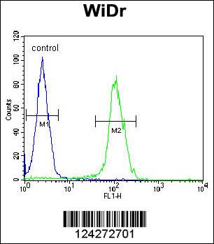 BEX1 Antibody (Center) (Cat. APR03465G) flow cytometric analysis of WiDr cells (right histogram) compared to a negative control cell (left histogram).FITC-conjugated goat-anti-rabbit secondary antibodies were used for the analysis. |