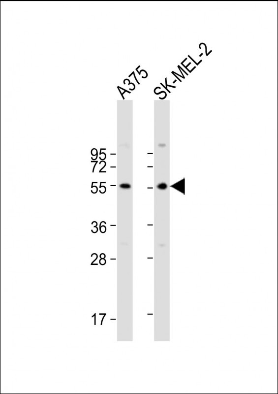 All lanes : Anti-GSDMC Antibody (Center) at 1:2000 dilution Lane 1: A375 whole cell lysate Lane 2: SK-MEL-2 whole cell lysate Lysates/proteins at 20 ug per lane. Secondary Goat Anti-Rabbit IgG, (H+L), Peroxidase conjugated at 1/10000 dilution. Predicted band size : 58 kDa Blocking/Dilution buffer: 5% NFDM/TBST.