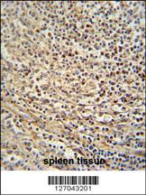 GSDMC antibody (Center) (Cat. APR03477G) immunohistochemistry analysis in formalin fixed and paraffin embedded human spleen tissue followed by peroxidase conjugation of the secondary antibody and DAB staining. This data demonstrates the use of the GSDMC antibody (Center) for immunohistochemistry. Clinical relevance has not been evaluated. |