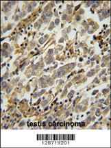 ASB17 Antibody (C-term) (Cat. APR03485G) immunohistochemistry analysis in formalin fixed and paraffin embedded human testis carcinoma followed by peroxidase conjugation of the secondary antibody and DAB staining. This data demonstrates the use of the ASB17 Antibody (C-term) for immunohistochemistry. Clinical relevance has not been evaluated.