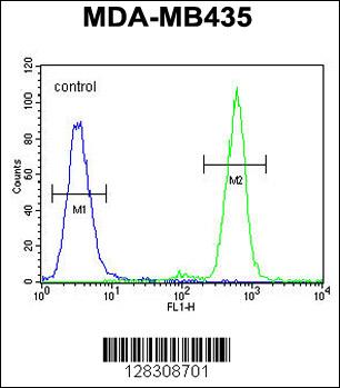 TAPT1 Antibody (C-term) (Cat. APR03486G) flow cytometric analysis of MDA-MB435 cells (right histogram) compared to a negative control cell (left histogram).FITC-conjugated goat-anti-rabbit secondary antibodies were used for the analysis. |