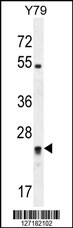 RP11-529I10.4 Antibody (Center) (Cat. APR03488G) western blot analysis in Y79 cell line lysates (35ug/lane).This demonstrates the RP11 antibody detected the RP11 protein (arrow).