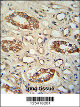 PPM1L antibody (C-term) (Cat. APR03513G) immunohistochemistry analysis in formalin fixed and paraffin embedded human lung tissue followed by peroxidase conjugation of the secondary antibody and DAB staining. This data demonstrates the use of the PPM1L antibody (C-term) for immunohistochemistry. Clinical relevance has not been evaluated. |