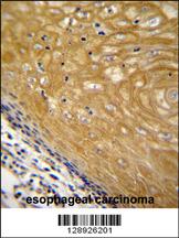 NUDT22 Antibody (C-term) (Cat. APR03548G)immunohistochemistry analysis in formalin fixed and paraffin embedded human esophageal carcinoma followed by peroxidase conjugation of the secondary antibody and DAB staining.This data demonstrates the use of NUDT22 Antibody (C-term) for immunohistochemistry. Clinical relevance has not been evaluated.