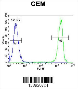 NUDT22 Antibody (C-term) (Cat. APR03548G) flow cytometric analysis of CEM cells (right histogram) compared to a negative control cell (left histogram).FITC-conjugated goat-anti-rabbit secondary antibodies were used for the analysis. |