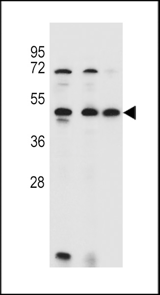 ANKRD40 Antibody (C-term) (Cat. APR03557G) western blot analysis in 293,HL-60,MCF-7 cell line lysates (35ug/lane).This demonstrates the ANKRD40 antibody detected the ANKRD40 protein (arrow).