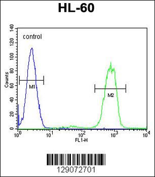 ANKRD40 Antibody (C-term) (Cat. APR03557G) flow cytometric analysis of HL-60 cells (right histogram) compared to a negative control cell (left histogram).FITC-conjugated goat-anti-rabbit secondary antibodies were used for the analysis. |