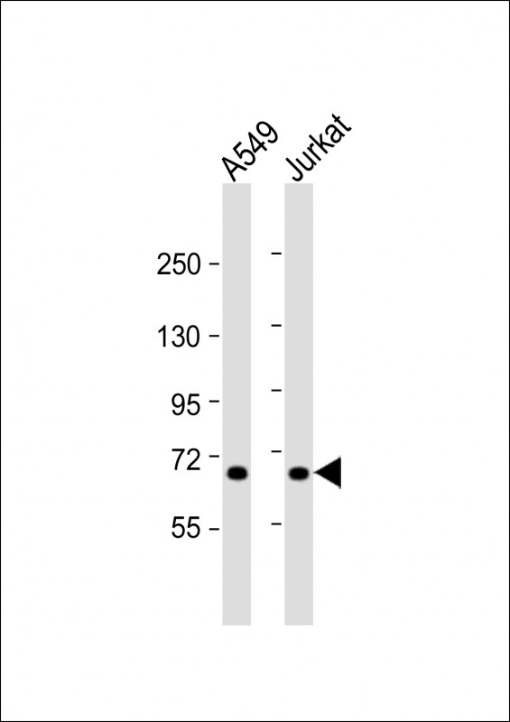 All lanes : Anti-F11 Antibody (Center) at 1:1000 dilution Lane 1: A549 whole cell lysate Lane 2: Jurkat whole cell lysate Lysates/proteins at 20 μg per lane. Secondary Goat Anti-Rabbit IgG, (H+L), Peroxidase conjugated at 1/10000 dilution. Predicted band size : 70 kDa Blocking/Dilution buffer: 5% NFDM/TBST.