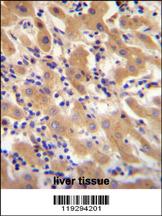 F11 Antibody (Center) (Cat. APR03580G)immunohistochemistry analysis in formalin fixed and paraffin embedded human liver tissue followed by peroxidase conjugation of the secondary antibody and DAB staining.This data demonstrates the use of F11 Antibody (Center) for immunohistochemistry. Clinical relevance has not been evaluated. |