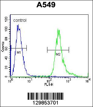 LRRC6 Antibody (Center) (Cat. APR03613G) flow cytometric analysis of A549 cells (right histogram) compared to a negative control cell (left histogram).FITC-conjugated goat-anti-rabbit secondary antibodies were used for the analysis. |