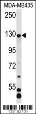 C7orf63 Antibody (N-term) (Cat. APR03692G) western blot analysis in MDA-MB435 cell line lysates (35ug/lane).This demonstrates the C7orf63 antibody detected the C7orf63 protein (arrow).