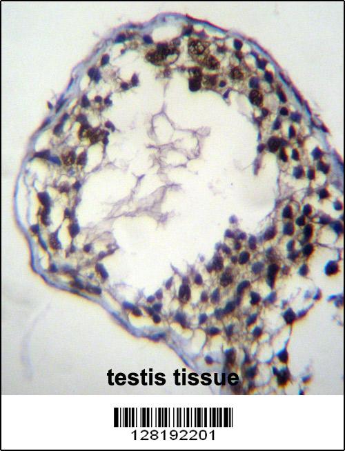 C7orf63 Antibody (N-term) (Cat. APR03692G)immunohistochemistry analysis in formalin fixed and paraffin embedded human testis tissue followed by peroxidase conjugation of the secondary antibody and DAB staining.This data demonstrates the use of C7orf63 Antibody (N-term) for immunohistochemistry. Clinical relevance has not been evaluated. |