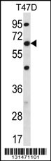 FAM83D Antibody (C-term) (Cat. APR03704G) western blot analysis in T47D cell line lysates (35ug/lane).This demonstrates the FAM83D antibody detected the FAM83D protein (arrow). |