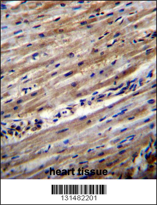 DUS1L Antibody (C-term) (Cat. APR03705G)immunohistochemistry analysis in formalin fixed and paraffin embedded human heart tissue followed by peroxidase conjugation of the secondary antibody and DAB staining.This data demonstrates the use of DUS1L Antibody (C-term) for immunohistochemistry. Clinical relevance has not been evaluated.
