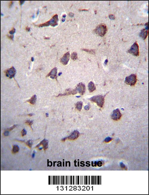 FKTN Antibody (Center) (Cat. APR03741G)immunohistochemistry analysis in formalin fixed and paraffin embedded human brain tissue followed by peroxidase conjugation of the secondary antibody and DAB staining.This data demonstrates the use of FKTN Antibody (Center) for immunohistochemistry. Clinical relevance has not been evaluated. |