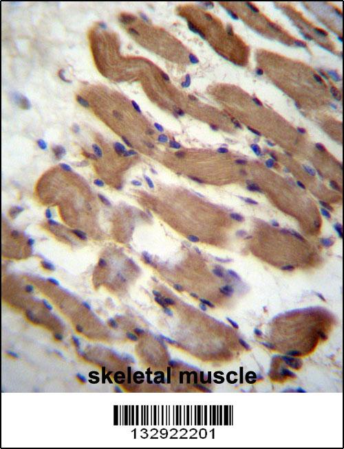 PALMD Antibody (N-term) (Cat. APR03788G)immunohistochemistry analysis in formalin fixed and paraffin embedded human skeletal muscle followed by peroxidase conjugation of the secondary antibody and DAB staining.This data demonstrates the use of PALMD Antibody (N-term) for immunohistochemistry. Clinical relevance has not been evaluated. |