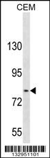 TGFBRAP1 Antibody (C-term) (Cat. APR03814G) western blot analysis in CEM cell line lysates (35ug/lane).This demonstrates the TGFBRAP1 antibody detected the TGFBRAP1 protein (arrow).