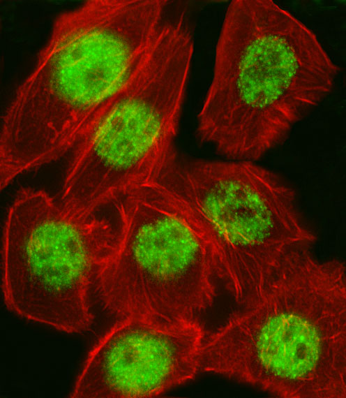Fluorescent image of A549 cell stained with CDKN1A Antibody (C-term)( APR03821G).A549 cells were fixed with 4% PFA (20 min), permeabilized with Triton X-100 (0.1%, 10 min), then incubated with CDKN1A primary antibody (1:25, 1 h at 37℃). For secondary antibody, Alexa Fluor? 488 conjugated donkey anti-rabbit antibody (green) was used (1:400, 50 min at 37℃).Cytoplasmic actin was counterstained with Alexa Fluor? 555 (red) conjugated Phalloidin (7units/ml, 1 h at 37℃).CDKN1A immunoreactivity is localized to Nucleus significantly.
