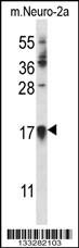 CDKN1A Antibody (C-term) (Cat. APR03821G) western blot analysis in mouse Neuro-2a cell line lysates (35ug/lane).This demonstrates the CDKN1A antibody detected the CDKN1A protein (arrow). |