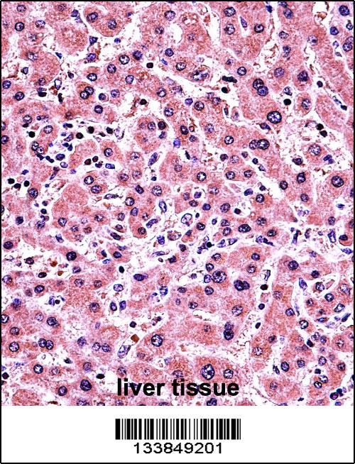 ALPP Antibody (Center) (Cat. APR03836G)immunohistochemistry analysis in formalin fixed and paraffin embedded human liver tissue followed by peroxidase conjugation of the secondary antibody and DAB staining.This data demonstrates the use of ALPP Antibody (Center) for immunohistochemistry. Clinical relevance has not been evaluated. |