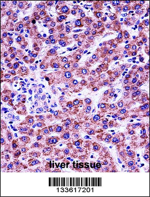 GYPB Antibody (Center) (Cat. APR03848G)immunohistochemistry analysis in formalin fixed and paraffin embedded human liver tissue followed by peroxidase conjugation of the secondary antibody and DAB staining.This data demonstrates the use of GYPB Antibody (Center) for immunohistochemistry. Clinical relevance has not been evaluated. |