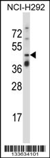 TNFRSF10A Antibody (C-term) (Cat. APR03849G) western blot analysis in NCI-H292 cell line lysates (35ug/lane).This demonstrates the TNFRSF10A antibody detected the TNFRSF10A protein (arrow). |