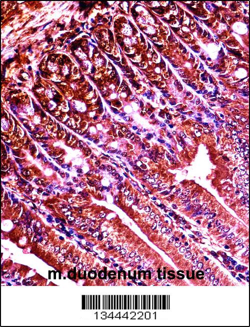 Mouse Abl1 Antibody (Center) (APR03886G)immunohistochemistry analysis in formalin fixed and paraffin embedded mouse duodenum tissue followed by peroxidase conjugation of the secondary antibody and DAB staining.This data demonstrates the use of Mouse Abl1 Antibody (Center) for immunohistochemistry. Clinical relevance has not been evaluated. |