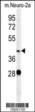 VASH2 Antibody (C-term) (Cat. APR03891G) western blot analysis in mouse Neuro-2a cell line lysates (35ug/lane).This demonstrates the VASH2 antibody detected the VASH2 protein (arrow).