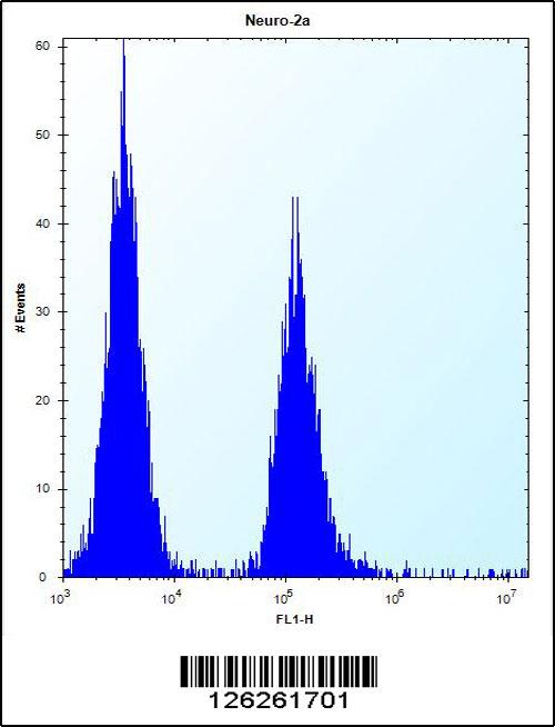 VASH2 Antibody (C-term) (Cat. APR03891G) flow cytometric analysis of Neuro-2a cells (right histogram) compared to a negative control cell (left histogram).FITC-conjugated donkey-anti-rabbit secondary antibodies were used for the analysis. |