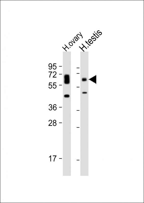 All lanes : Anti-POTE Antibody (C-term L446) at 1:500 dilution Lane 1: human ovary lysate Lane 2: human testis lysate Lysates/proteins at 20 μg per lane. Secondary Goat Anti-Rabbit IgG, (H+L), Peroxidase conjugated at 1/10000 dilution. Predicted band size : 66 kDa Blocking/Dilution buffer: 5% NFDM/TBST.