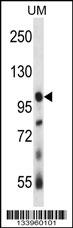 USP4 Antibody (N-term) (Cat. APR03989G) western blot analysis in human uterine tumor tissue lysates (35ug/lane).This demonstrates the USP4 antibody detected the USP4 protein (arrow).