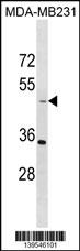 TAPBP Antibody (N-term) (Cat. APR04344G) western blot analysis in MDA-MB231 cell line lysates (35ug/lane).This demonstrates the TAPBP antibody detected the TAPBP protein (arrow). |