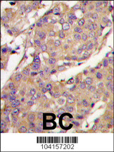 Formalin-fixed and paraffin-embedded breast carcinoma tissue reacted with UBE2L6 Antibody (C-term)(Cat.APR04798G), which was peroxidase-conjugated to the secondary antibody, followed by DAB staining. This data demonstrates the use of this antibody for immunohistochemistry; clinical relevance has not been evaluated. |
