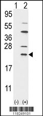 Western blot analysis of UBE2C (arrow) using rabbit polyclonal UBE2C Antibody (N-term G25) (Cat. APR04799G). 293 cell lysates (2 ug/lane) either nontransfected (Lane 1) or transiently transfected with the UBE2C gene (Lane 2) (Origene Technologies).(8ug/ml) |