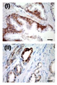 IHC for USP2a in a formalin-fixed, paraffin-embedded human prostate sample. Cytoplasmic positive immunostaining was detected in tumor glands (ii), whereas in normal prostatic epithelium, USP2a expression was restricted to the basal layer. |